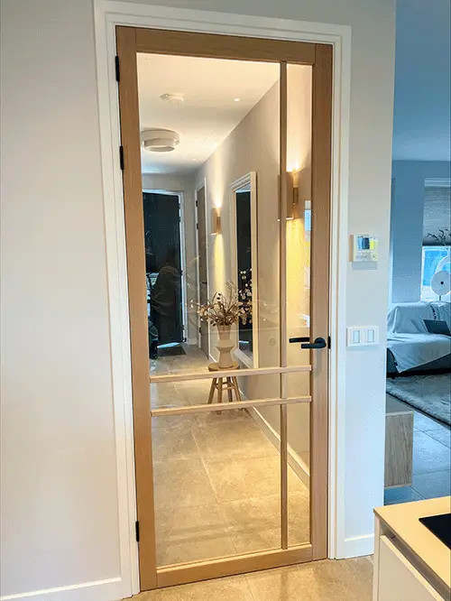 Transparant glas in eikenhouten binnendeuren wordt doorgaans het meeste gebruikt. Logisch, want het speelt een grote rol in de uitstraling van de deur. Naast dat het voor een frisse, gezonde uitstraling zorgt, creëer je er ook een rustig element van in jouw inrichting.
